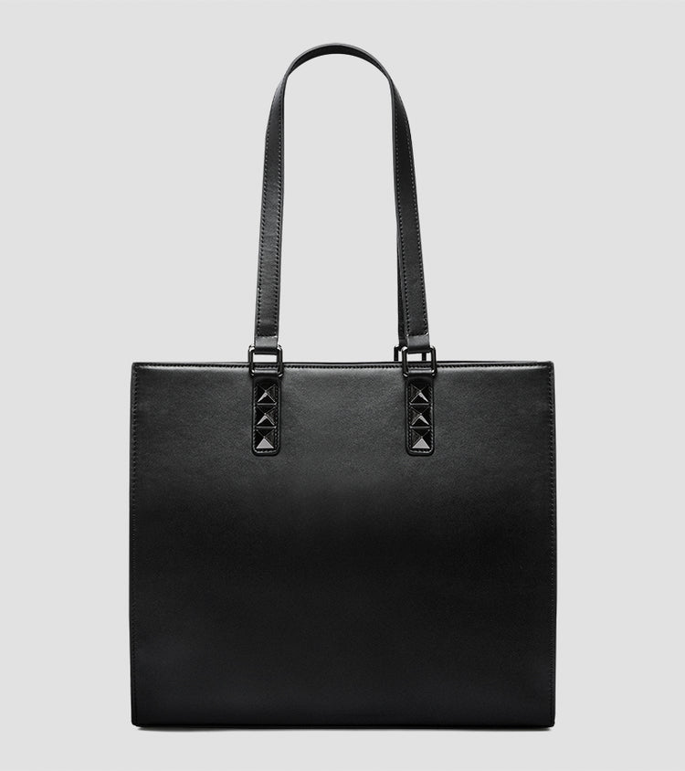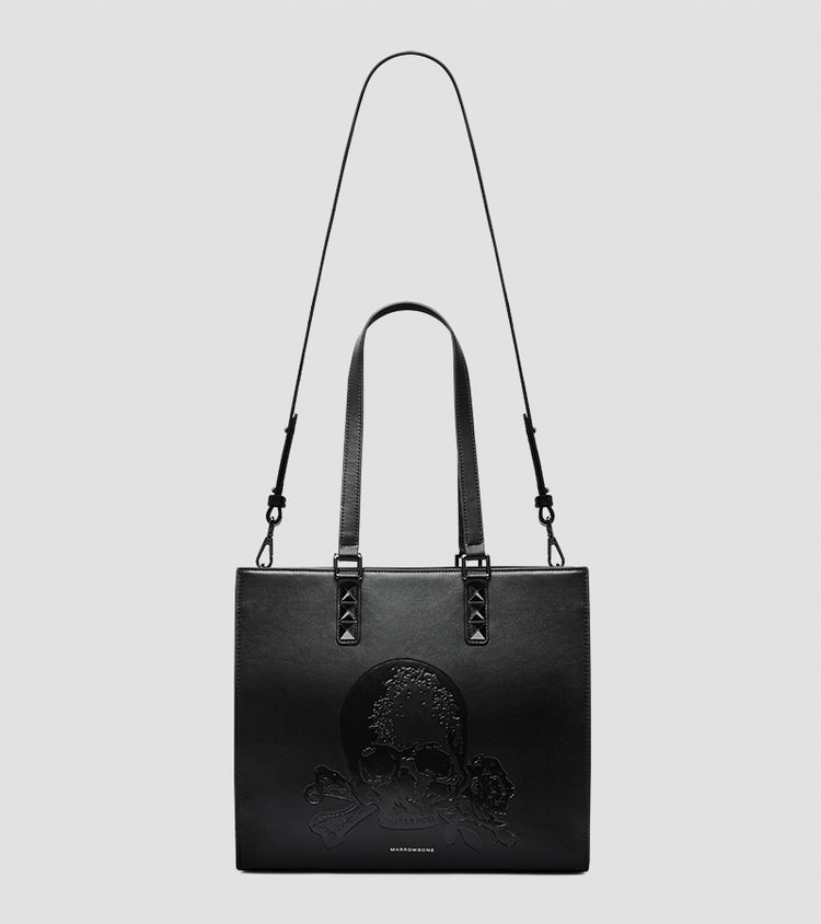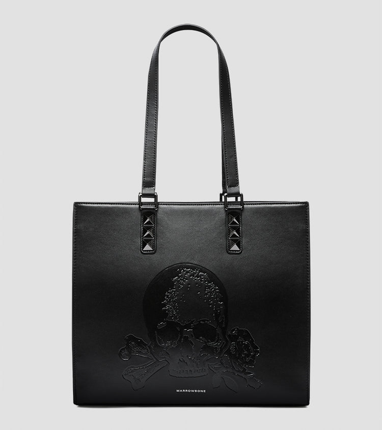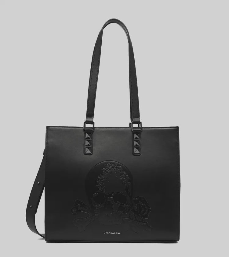A true statement of wearable luxury, the Calvalia Tote is defined by its signature embossed skull, pyramid stud accents, and pyramid stud hardware. Protective squared feet add structure, while the practical interior pockets and adjustable strap ensure effortless versatility.