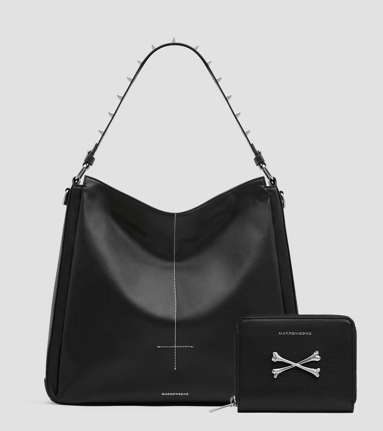 The Inverted Cross Bag makes an impact with its slouchy silhouette, spiked shoulder strap, and signature coffin zippers, while the Crossbones Wallet keeps your essentials in check with brushed silver metal details and extra internal storage for smaller items.